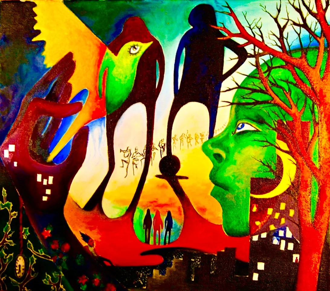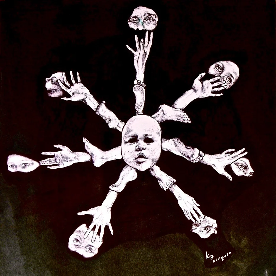 First you are born thus the face, but the first distinguishing factor in your life is where you stand, thus there are 7 tendons representing the 7 continents. The second factor of the hands resembles what your necessities are to survive but also how far your reach & desires can go. That is the basis of your perspective that should only keep expanding, the eyes being the symbol of perception.