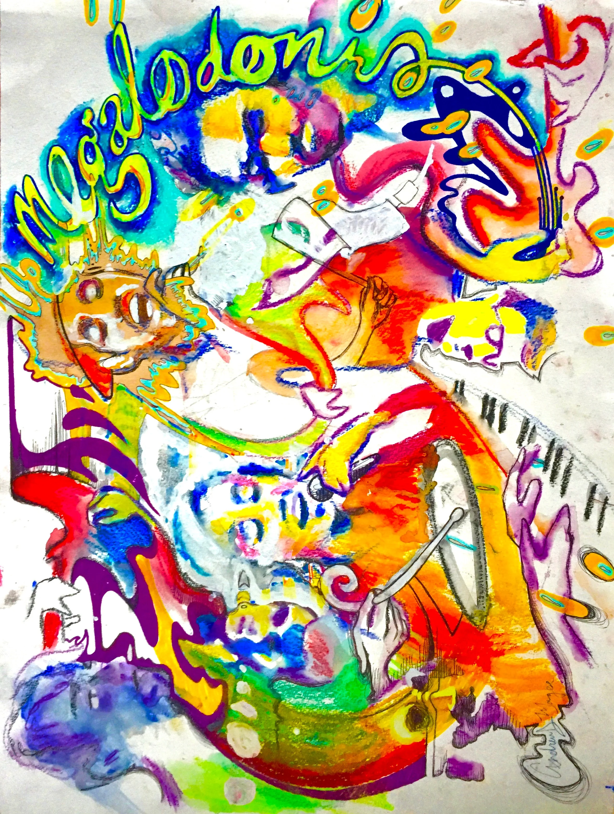2015 Super Moon, watercolor crayons, bic pen, oil pastels, spilt wine, marker & white-out